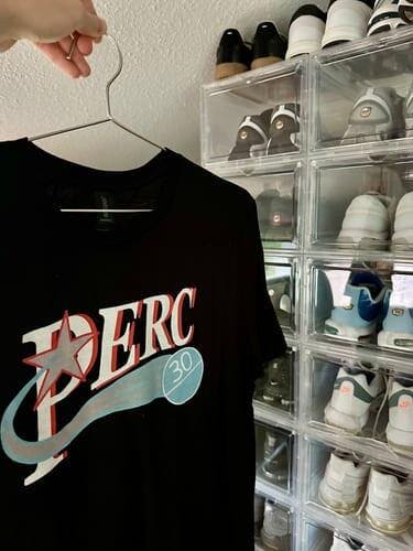 Dieses „Perc 30“ T-Shirt greift das klassische Philadelphia 76ers Logo auf und interpretiert es auf kreative Weise neu. Statt der bekannten Zahl „76ers“ steht hier „Perc 30“ – ein Begriff, der häufig in US-Rap-Texten erwähnt wird und in der Hip-Hop-Kultur eine eigene Symbolik entwickelt hat.